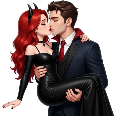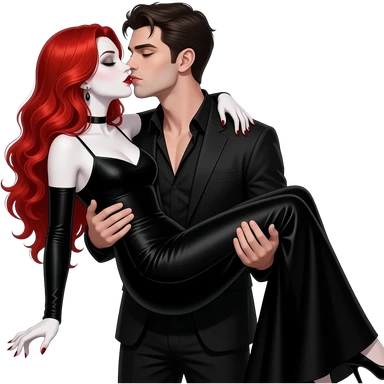 Vampiro femmina adolescente con capelli lunghi rosso fuoco ondulati con pelle bianca che indossa un vestito lungo con le maniche strette e nero che è tenuta in braccio dal suo ragazzo VAMPIRO con la pelle chiara e si stanno baciando emoji