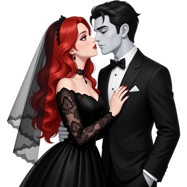 Vampiro femmina adolescente con capelli lunghi rosso fuoco ondulati con pelle bianca che indossa un vestito da sposa lungo con le maniche lunghe e nero e il velo nero con le ginmiciu nereche si sta sposando con il suo ragazzo VAMPIRO con la pelle chiara e si stanno baciando emoji