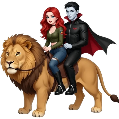 Vampiro adolescente femmina con pelle bianca e capelli rosso ondulati lunghi che indossa dei jeans neri a zampa d' elefante e un top stretto con le maniche lunghe stile militare che cavalca un leone con suo fratello VAMPIRO maschio con la pelle bianca e una tuta nera che cavalcano insieme emoji