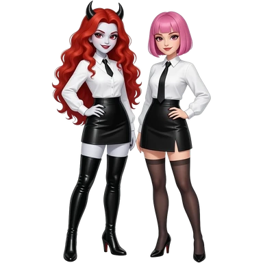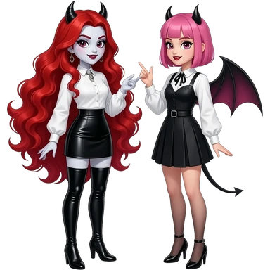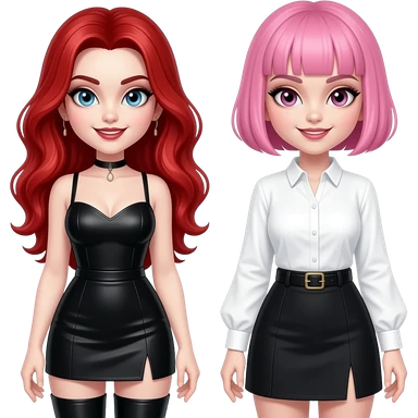 Vampiro femmina con capelli lunghi rosso fuoco ondulati con pelle bianca che indossa degli stivali stretti lunghi, neri e con il tacco una gonna corta nera e una camicetta con le maniche lunghe bianca con una sua amica vampiro FEMMINA che ha i capelli con la frangia corti e rosa emoji