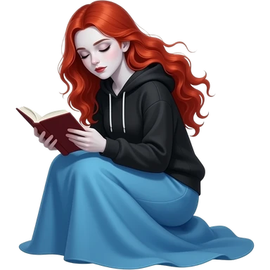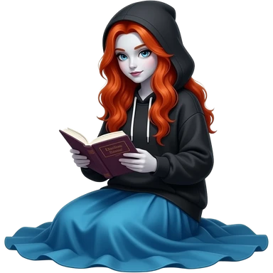 Vampiro femmina adolescente con capelli lunghi rosso fuoco ondulati con pelle bianca che indossa una gonna lunga azzurra e una felpa-top con cappuccio un po' larga nera e che sta leggendo seduta per terra emoji