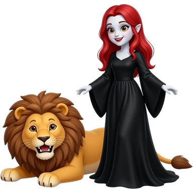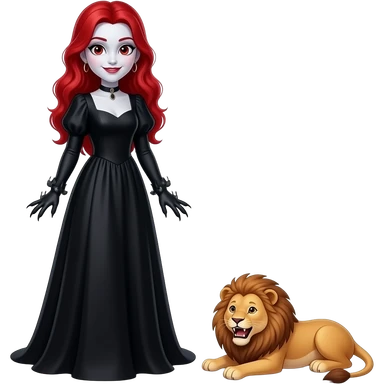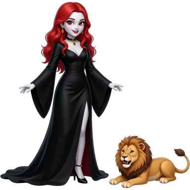 Vampiro femmina adolescente con la pelle bianca e i capelli rossi che indossa un vestito lungo nero e le maniche a zampa d' elefante e guarda il suo leone CUCCIOLO PICCOLO che si rotola per terra ed è felice emoji