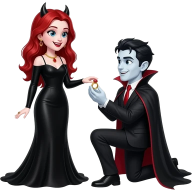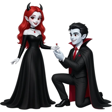 Vampiro femmina adolescente con la pelle bianca e i capelli rossi che indossa un vestito lungo nero e le maniche lunghe e il suo fidanzato vampiro con la pelle bianca sie è inginocchiato per farle la proposta di matrimonio dandole un anello d'oro con un rubino gigante rosso e sono felici emoji