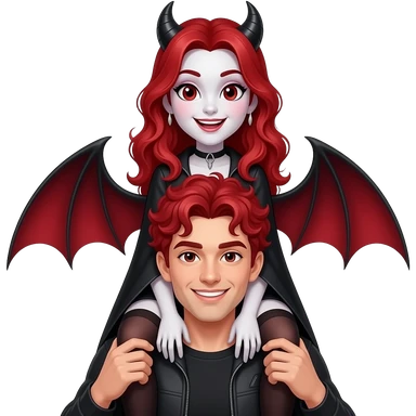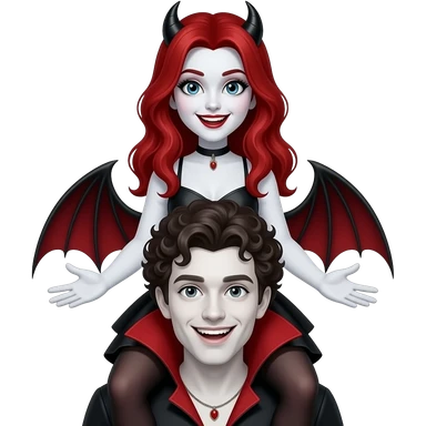 Vampiro femmina adolescente con la pelle bianca e i capelli rossi che sta sopra la schiena del suo fidanzato VAMPIRO con la pelle bianca e i capelli ricci e sono felici emoji