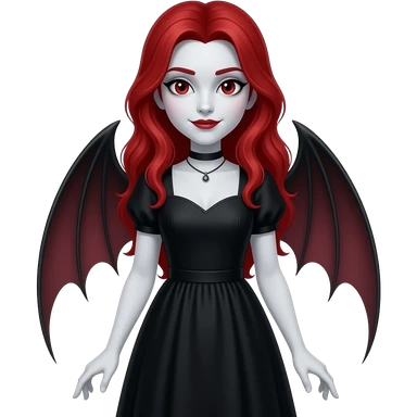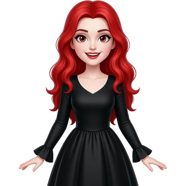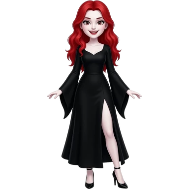 Vampiro femmina adolescente con la pelle bianca e i capelli rossi che indossa un vestito lungo e largo sotto nero e le maniche lunghe e i tacchi ed è felice emoji
