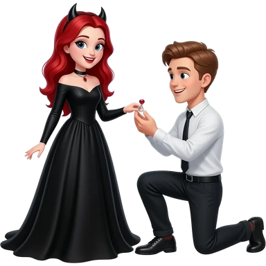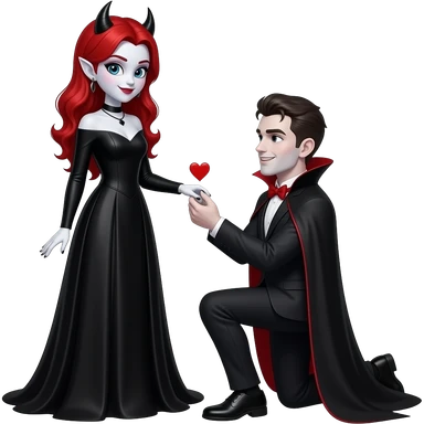 Vampiro femmina adolescente con la pelle bianca e i capelli rossi che indossa un vestito lungo e largo sotto nero e le maniche lunghe e il suo fidanzato vampiro con la PELLE BIANCA sie è inginocchiato per darle un anello con un rubino rosso e sono felici emoji