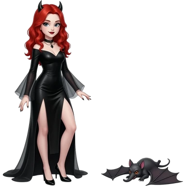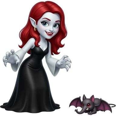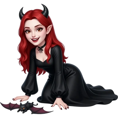 Vampiro femmina adolescente con la pelle bianca e i capelli rossi che indossa un vestito lungo nero e le maniche larghe e guarda il suo pipistrello che si rotola per terra ed è felice emoji