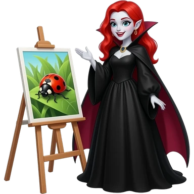 Vampiro femmina adolescente con la pelle bianca e i capelli rossi che indossa un vestito lungo e largo sotto nero e le maniche larghe e guarda una coccinella ed è felice emoji