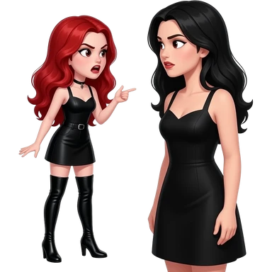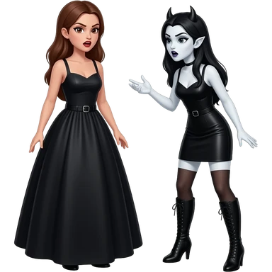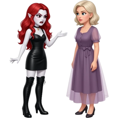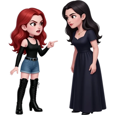 Vampiro femmina adolescente con pelle bianca che indossa un tubino nero e degli stivali lunghi neri con tacco i capelli lunghi ondulati rossi che parla ARRABBIATA con la madre che indossa un vestito stretto in vita e largo sotto si guardano negli occhi emoji | AI Emoji Generator