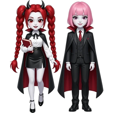 Vampiro femmina ADOLESCENTE con pelle bianca e capelli rossi indossa un vestito con le maniche lunghe nero, gli stivali lunghi neri con il tacco e sta sulla schiena con le GAMBE intorno al collo del suo fidanzato VAMPIRO con la pelle bianca e i capelli neri e sono felici emoji | AI Emoji Generator