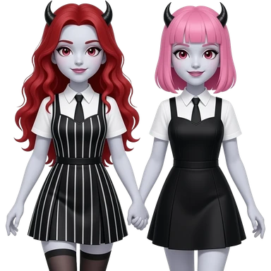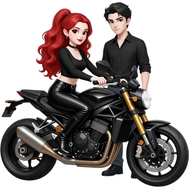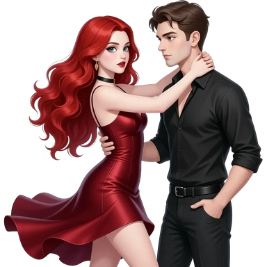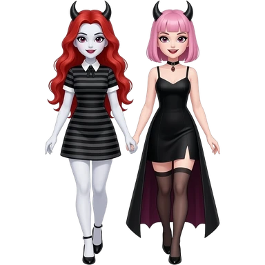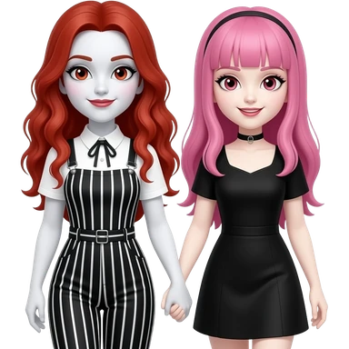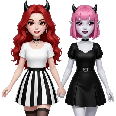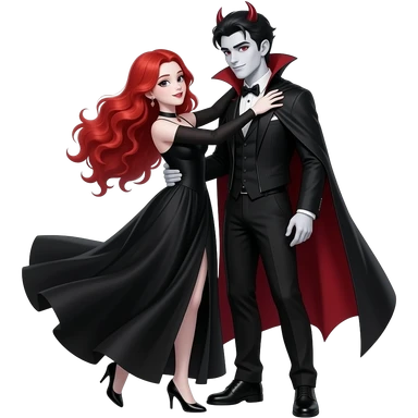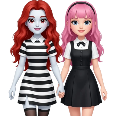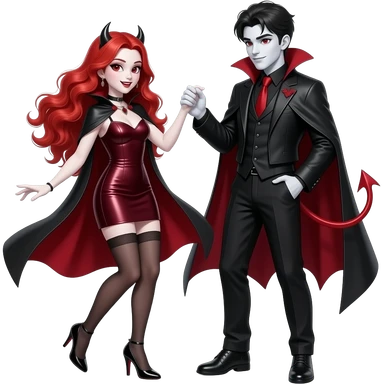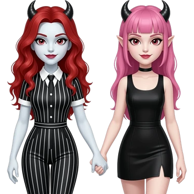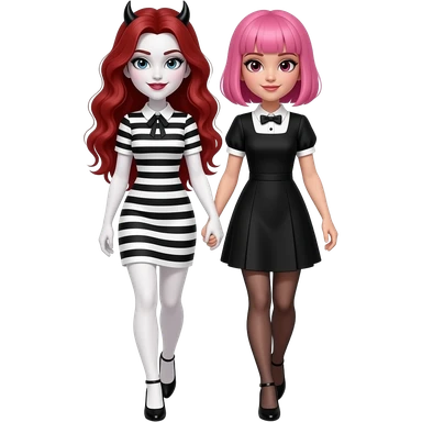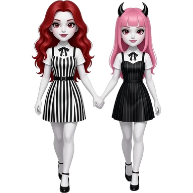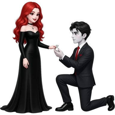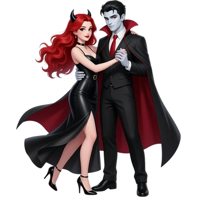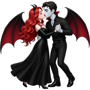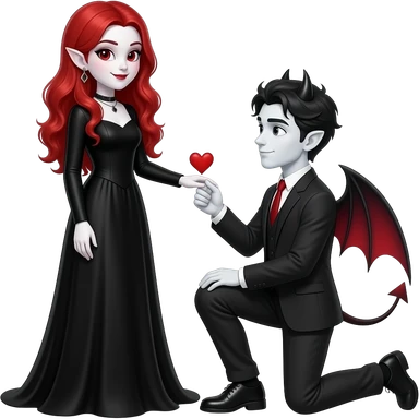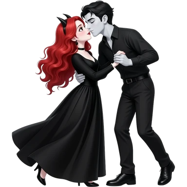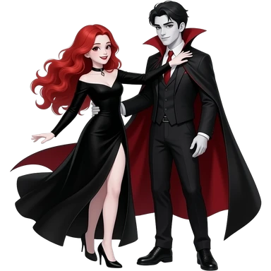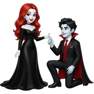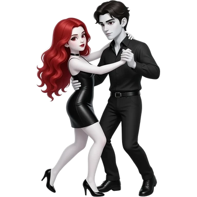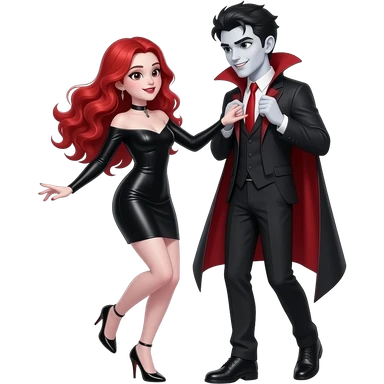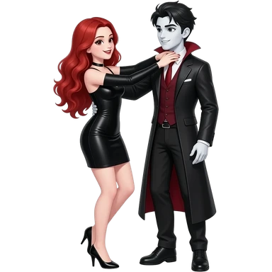 Vampiro femmina ADOLESCENTE con pelle bianca e capelli rossi lunghi che indossa una gonna corta nera e un top con le maniche lunghe e degli stivali lunghi neri con tacco che cammina con al guinzaglio un Corgi e tiene per mano il suo ragazzo emoji | AI Emoji Generator