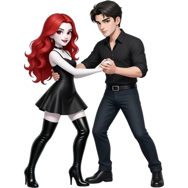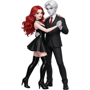 Vampiro femmina adolescente con pelle bianca e capelli rosso ondulati lunghi raccolti in una mezza coda che indossa un vestito stretto in vita e LUNGO sotto con maniche lunghe nero che sta baciando il suo ragazzo VAMPIRO dietro la luna rossa emoji | AI Emoji Generator