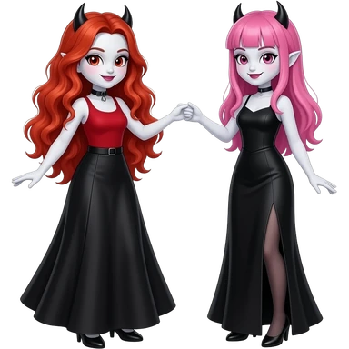 Vampiro femmina adolescente con capelli lunghi rosso fuoco ondulati con pelle bianca con gonna lunga nera e top canottiera rossa che balla con la sua amica VAMPIRA femmina che indossa un vestito lungo nero con pelle bianca e capelli rosa con la frangetta emoji
