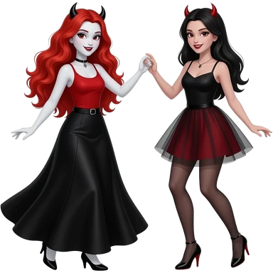 Vampiro femmina adolescente con capelli lunghi rosso fuoco ondulati con pelle bianca con gonna lunga nera e top canottiera rossa che balla con la sua amica VAMPIRA femmina emoji