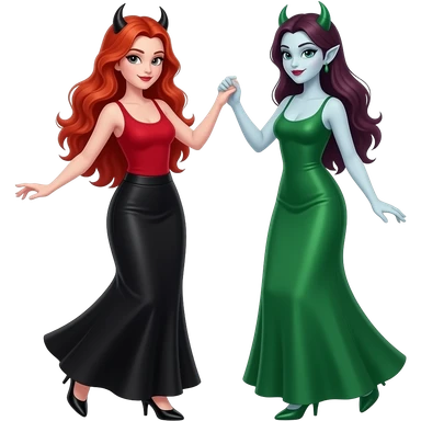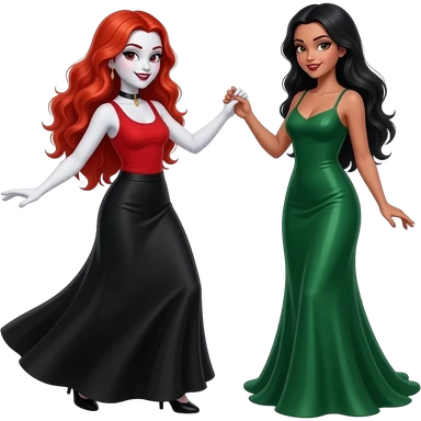 Vampiro femmina adolescente con capelli lunghi rosso fuoco ondulati con pelle bianca con gonna lunga nera e top canottiera rossa che balla con la sua amica VAMPIRA femmina che indossa un vestito lungo verde emoji