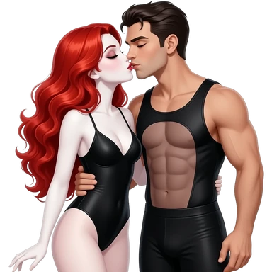 Vampiro femmina con capelli lunghi rosso fuoco ondulati con pelle bianca che in costume da bagno, due pezzi nero bacia il fidanzato VAMPIRO che è in costume da bagno emoji