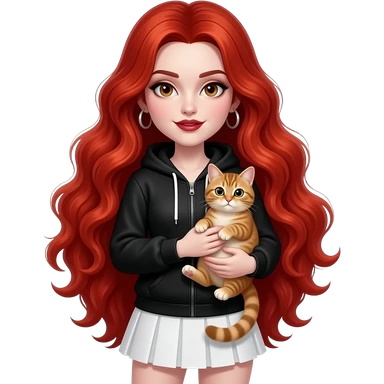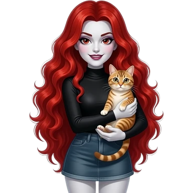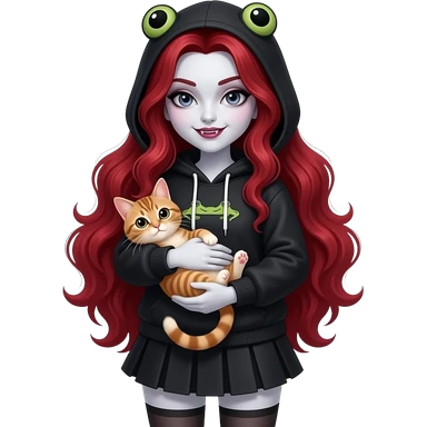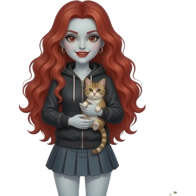 Vampiro femmina con capelli lunghi rosso fuoco ondulati con pelle bianca con gonna corta e felpa attilalante nera con anfibi che tiene in braccio un gattino europeo emoji