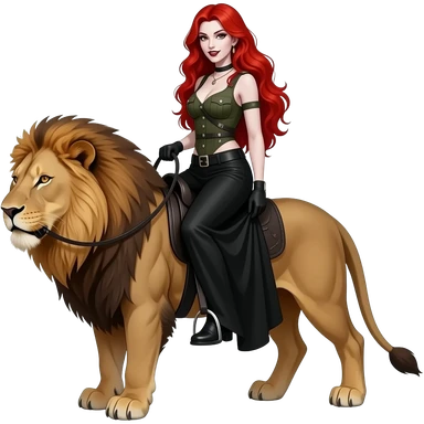 Vampiro femmina adolescente con capelli lunghi rosso fuoco ondulati con pelle bianca con gonna lunga nera e top canottiera stile militare che cavalca un leone FEMMINA emoji