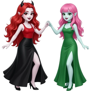 Vampiro femmina adolescente con capelli lunghi rosso fuoco ondulati con pelle bianca con gonna lunga nera e top canottiera rossa che balla con la sua amica VAMPIRA femmina che indossa un vestito lungo verde con pelle bianca e capelli rosa con la frangetta emoji
