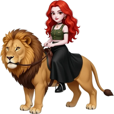 Vampiro femmina con capelli lunghi rosso fuoco ondulati con pelle bianca con gonna lunga nera e top canottiera stile militare che cavalca un leone FEMMINA emoji