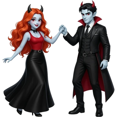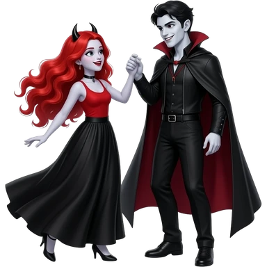 Vampiro femmina adolescente con capelli lunghi rosso fuoco ondulati con pelle bianca con gonna lunga nera e top canottiera rossa che balla con il suo fidanzato VAMPIRO emoji
