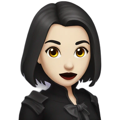“Emoji girl, porcelain skin, sharp eyeliner, vampy deep red lips, straight jet-black hair with bangs, intense eyes, wearing black silk dress.” emoji