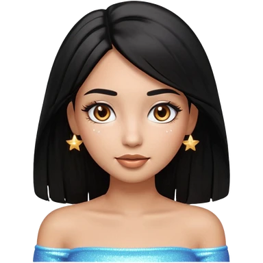 pretty cartoon girl, semi-realistic 3D emoji style, long middle parted straight black hair, tan skin, brown eyes, long eyelashes, soft glam makeup, glossy lips, smooth skin, cute aesthetic, sparkles in hair, white tube top emoji