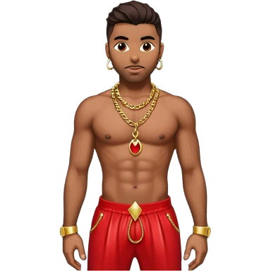 Ginuwine with dark brown hair, shirtless with necklace, latex red harem pants emoji