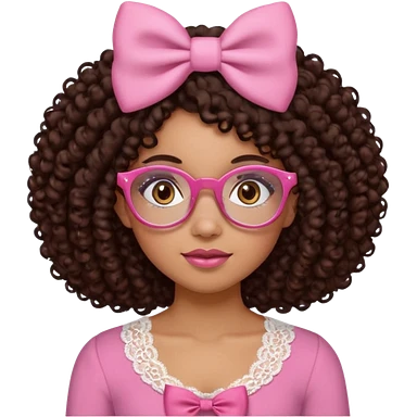 medium-light kinned afro-latina girl with medium length chocolate brown side part curly hair, small pink bow , with brown glasses, brown eyes, pink and white sweetheart necklined top with lace, round wide-ish nose, ob-long face emoji