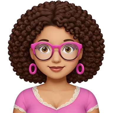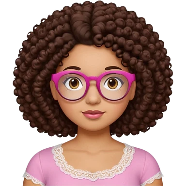 medium-light kinned afro-latina girl with medium length chocolate brown side part curly hair, brown glasses, brown eyes, pink sweetheart necklined top with lace, round wide-ish nose, chubby oblong face emoji