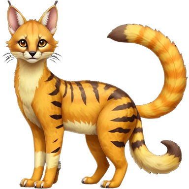 Dark gloomy orange-golden-yellowish-beige-gradients colorful painted marked patterned Asian glorious divine exotic cute cool beautiful shiny beautiful fantasy-caracal-civet-genet-sergal-vernid-Cacomistle-oncilla-animal-Fakémon-hybrid-fursona (full body) emoji