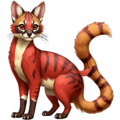 Vibrant-colored red-dark-brownish-furred colorful painted marked patterned Asian glorious divine exotic cute cool beautiful shiny beautiful fantasy-caracal-civet-genet-sergal-vernid-Cacomistle-oncilla-animal-Fakémon-hybrid-fursona (full body) emoji