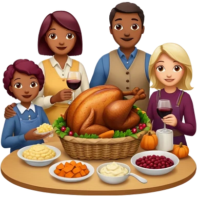 Thanksgiving Dinner with friends of all different races; have the food be a cooked turkey, mashed potatoes, corn, a basket of biscuits, a small bowl of cranberry sauce, baked yams, steamed vegetables, and a bottle of wine. emoji