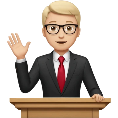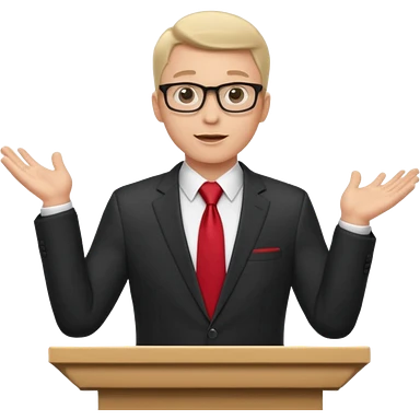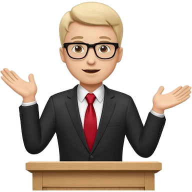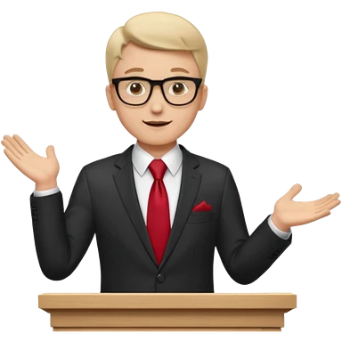 A professional clean-shaven man in a dark business suit and red tie standing behind a podium, confidently delivering a speech. Hands slightly open in a welcoming gesture, soft studio lighting, neutral dark background, friendly facial expression, glasses, elegant and corporate look. emoji