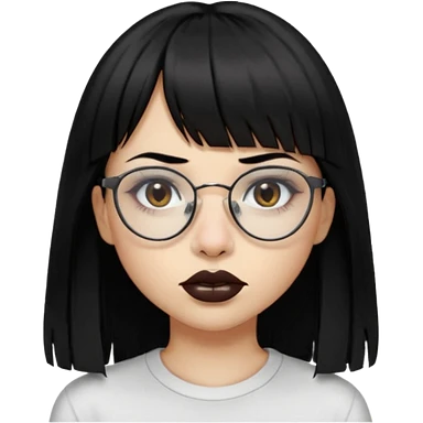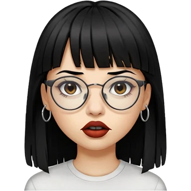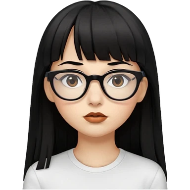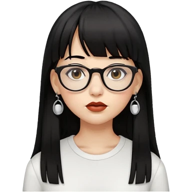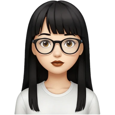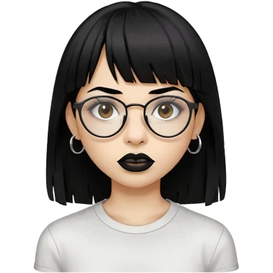 uma mulher snapchat icon, cor da pele normal, cabelo preto liso solto grande com franja vegana, curta, óculos pretos, com piercing na boca e nariz, olhos castanhos, camisa branca, a tela de fundo branca, coloque um piercing, um metal na boca e no nariz, cicatriz na sobrancelha, cor da boca preto, emoji