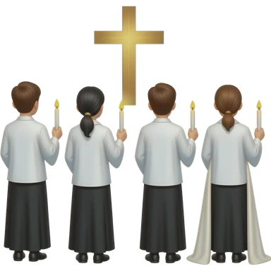 Gente en la iglesia, de espaldas, vestida de blanco arriba, negro abajo, con una vela en la mano, por la vigilia pascual emoji