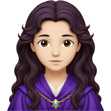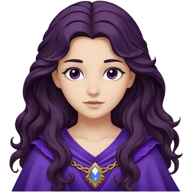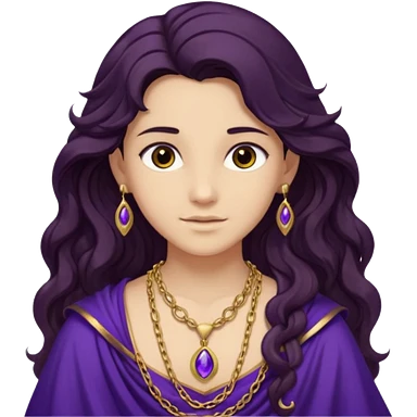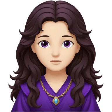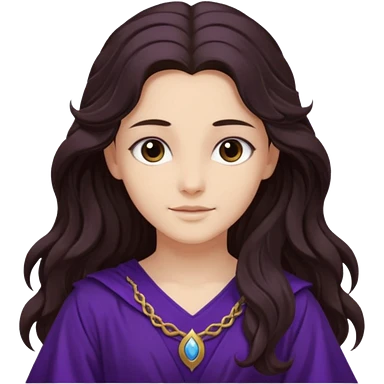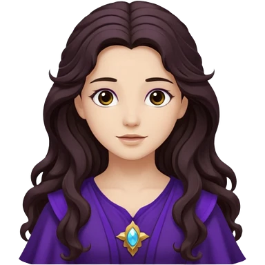 Libera from Olympus Gods with long dark brown wavy hair, deep purple tunic emoji