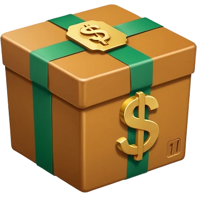 Closed box with smooth, rounded edges Light honey‑brown tape strip with a glossy highlight Flat green bill with a bold white dollar sign, anchored at the bottom left of the box Slight soft shadow under the bill for depth Plain white background for that crisp, emoji‑ready finish emoji