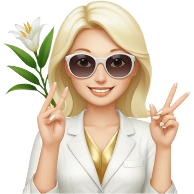 Professional sexy woman smiling holding lilies posing in shades and flashing peace sign fingers emoji