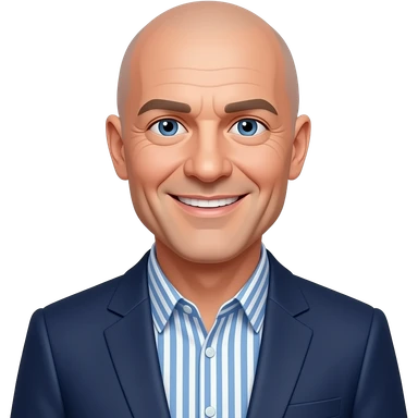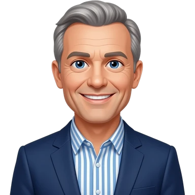 DJR - man, friendly smile, mid 70's, half bald, blue eyes, slim face, blue and white vertical striped button up shirt, dark blue blazer emoji