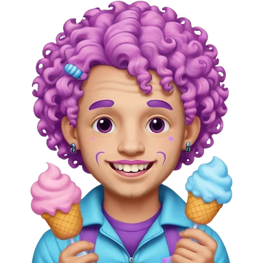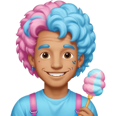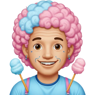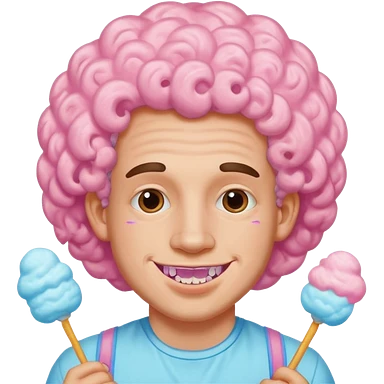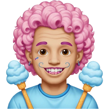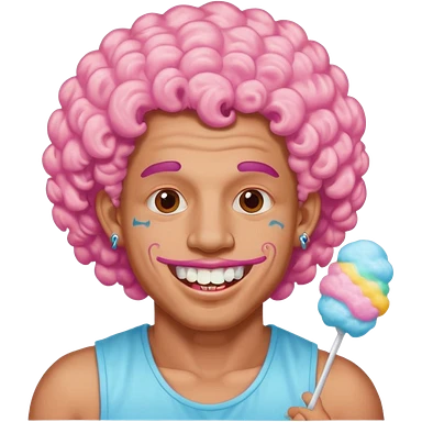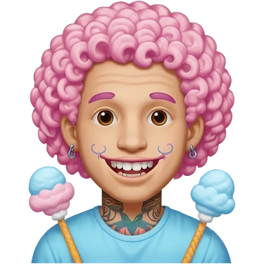very cheerful colorful puffy curly haired man made out of cotton candy with braces and tattoos and just face emoji