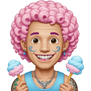 very cheerful colorful puffy curly haired man made out of cotton candy wearing teeth-braces and tattoos and face tattoos just face emoji