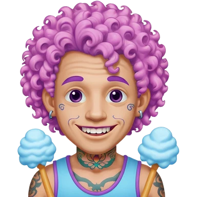 very cheerful colorful puffy violet curly haired man made out of cotton candy wearing teeth-braces and tattoos and face tattoos just face emoji