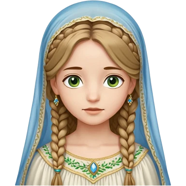 Joven de unos 20 años, de aspecto dulce y elegante. Piel clara, ojos expresivos (pueden ser azules o verdes) Rubio o castaño claro, largo, con trenzas o velo. Vestido largo de tonos suaves (blanco, azul o lavanda), con bordados dorados; un manto o toca fina cubriendo la cabeza. emoji
