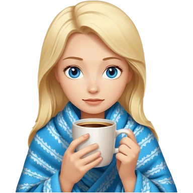 Blonde with blue eyes wrapped up in a cozy blanket with a hot coffee emoji