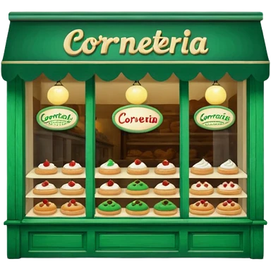The image shows the front window of a bakery named "Cornetteria". The window is framed by a green wooden frame and has a sign above it that reads "CORNETTERIA". emoji