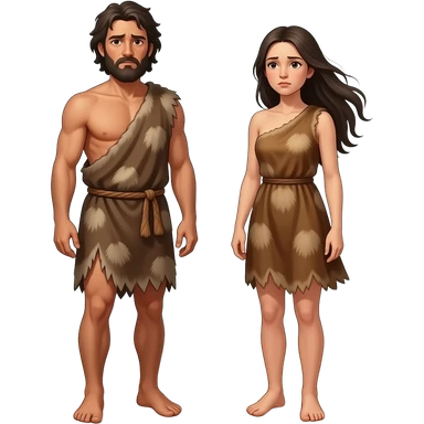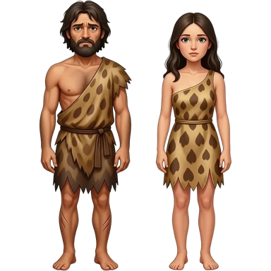 Adam and Eve in a desolate land wearing animal skins for clothing and look worn and tired emoji