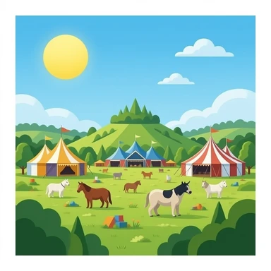 A vibrant festival scene with colorful tents, balloons, and a Ferris wheel emoji