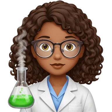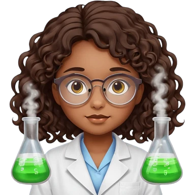 realistic bratz doll with long loose curly dark brown hair, glasses that are round cat eye vibes, in a lab coat mixing beakers that glow emoji