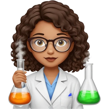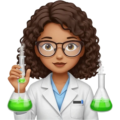 realistic bratz doll with long curly dark brown hair, glasses that are round cat eye vibes, in a lab coat mixing beakers that glow emoji